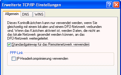 Bestätigen Sie diese Änderung mit einem Klick auf "OK". Im noch offenen Fenster "Eigenschaften" markieren Sie "Internetprotokoll (TCP/IP)" und klicken darunter auf "Eigenschaften". Im sich dann öffnenden weiteren Fenster klicken Sie auf "Erweitert...". Entfernen Sie hier das Häkchen bei "IP-Headerkomprimierung verwenden" (siehe Bild):